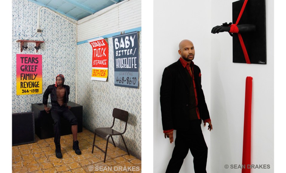 Erotic Art Week credits (from top left):  Jerome wears black jumpsuit with hand-dyed hoody.  Installation: “Cc: Everybody“ by Rodell Warner & Brianna McCarthy, shot at Brooklyn Bar.  Pictured right: Keive wears black suit with base stitching paired with black and claret polka-dot shirt with pleated organdy trim, designs by Anthony Reid.  Installation: “Mine“ by Chris Alexis, shot at Bohemia.