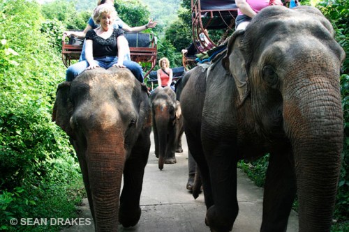 Seeking a thrill, I drive to The Jungle House and shell-out U$6 to be strapped atop an elephant for a fear-inducing trek through a muddy forest trail and murky river. Half of Thailand’s 7,000 elephants work, the others are wild, according to my guide Yui. Government frowns on locals who bring elephants to urban streets to entertain tourists. To complete an exhilarating day I scour a lively night market for vendors selling flash fried crickets, grasshoppers and beetles. The crunchy critters ar