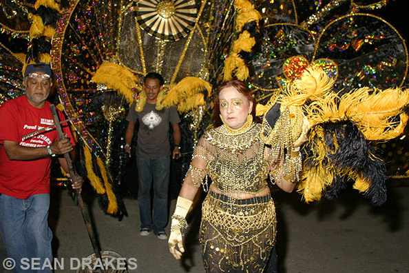Three dozen 20-foot fiberglass rods can weigh almost a ton, at least they can register as such to the eye.  Once inside a magnificent queen costume, many contestants require brace and acceleration support to negotiate stage ramps and to delay exhaustion.  Susanne Low (above) as Orisha Goddess of the Sea.