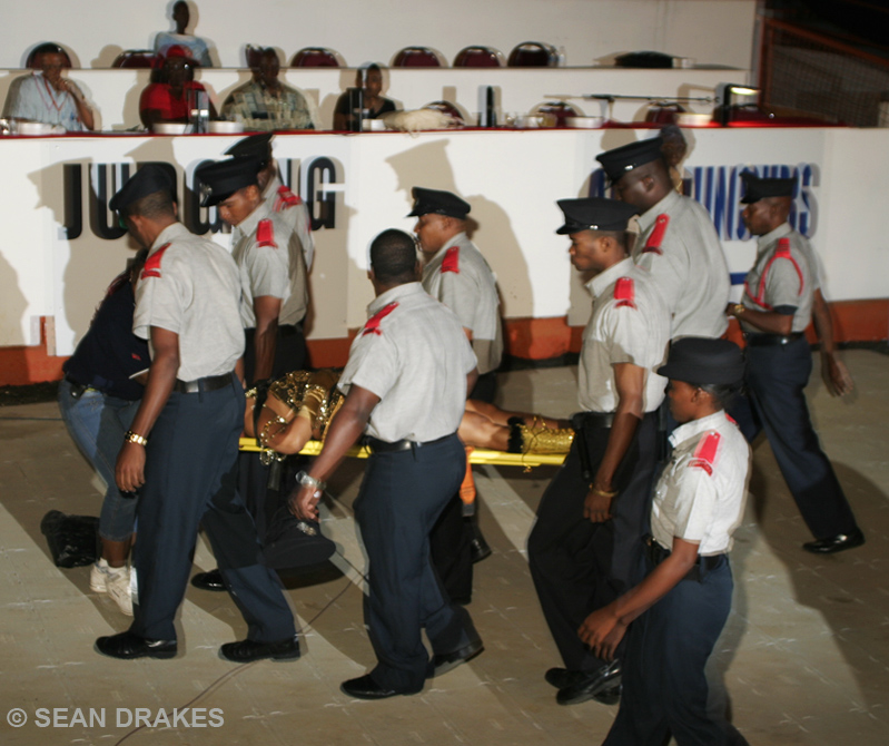 Joan Mohammed (above) as The Lady of The Night in Las Vegas approaches the Queen’s Park Savannah stage in the semi-final round.  Three minutes after donning her full costume, and before she could circle the entire stage once, she was overcome by brutal winds that swept her costume into a spin, and pushed her face forward to the stage floor.  Mohammed endured a bruised knee.  She received brisk applause as she was carried from the arena on a stretcher (below).