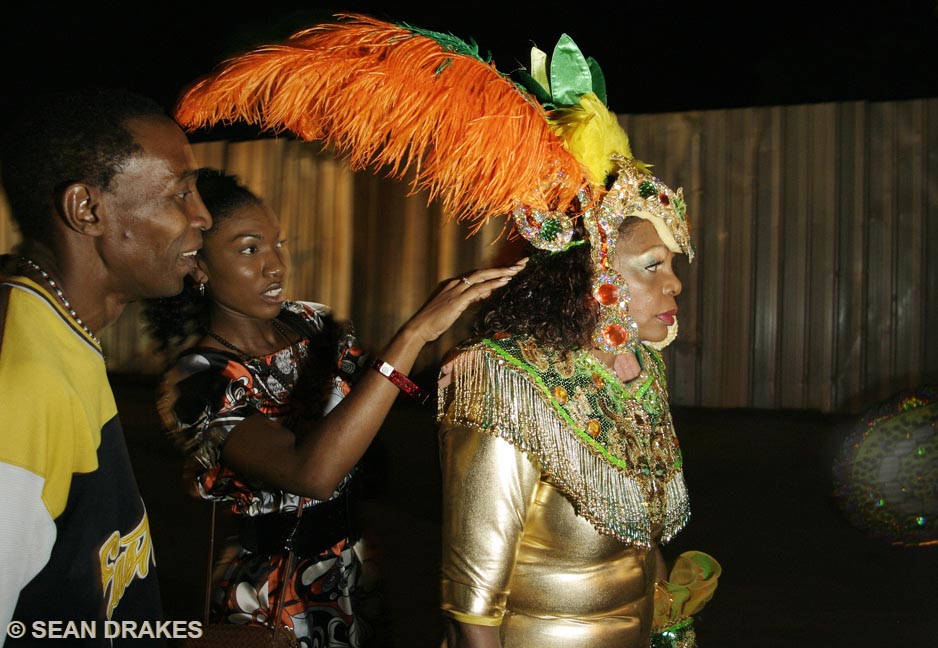 When I’m idle and find myself at an event without official credentials, I sometimes get lucky to get limited access.  This mini photo-essay wasn’t an intended pursuit, nor did I devote a high level of gusto to shoot it.  This was the semi-final round of competition.  I considered focusing on the kings but guys weren’t as relaxed in the presence of a camera, and had less frenzy around their preparation process.  At this festival, masqueraders are conditioned to put on a happy front for a camera.  That usually offers a stale image and  increases the challenge to capture the various emotions contestants experience backstage.  What becomes of idle time and a spontaneous spirit is unpredictable.  (It’s unlikely I’ll further develop this unpublished work-in-progress without incentive.)