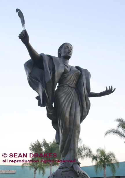 olds “a feather of peace found not only in Native American culture but it was used by the Egyptian goddess Maat,” shared Binns, “her left breast is concealed while the other is exposed, not for pornographic nature […] in the Amazon women warriors used bow and arrows and amputated their left breast to make it easier to draw their bow—the breast is symbolic of the source of mineral resources for all humanity, and her form is modeled on the continent of Africa that is sublimely established in her shape.” This graceful two-ton monument, valued at U$200,000, would be followed by six reproductions to be placed in Africa, Australia, Brazil, China, India and Spain if this portrait sculptor’s vision is ever realized.