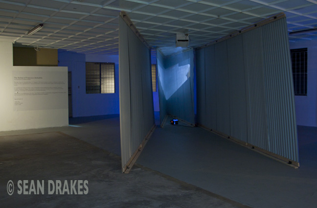 “I am using galvanize to keep a connection to all that galvanize you see when you look out the windows. In the installation you have different point of views,” explains Griffith, “in the middle of the installation there’s a projection. I wanted to simulate the idea of walking down a street or a lane. Belmont has many tight lanes. There’s a voyeuristic quality moving around these spaces. Depending on where you live, if you open your window you might be looking into someone’s bedroom. Many streets run into somebody’s house or a dead end. Very much like the installation, you walk into a dead end.”