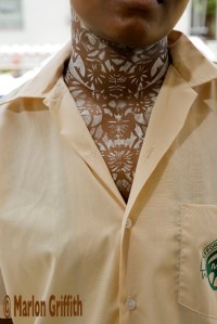 In 2009, Griffith, an illustrator from Belmont who lives in Nagoya, Japan, constructed a photographic project around powdered necks, titled The Powder Box Schoolgirl Series. He cast girls in school uniforms and incorporated iconic logos into his narrative on branding Black bodies. “Coming from a Carnival background I thought it would be interesting to use it as a kind of intervention to comment on things that are happening around us, and to empower the person that is wearing the powder.”