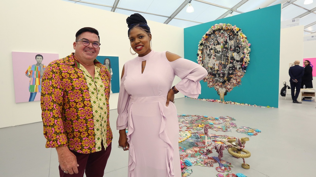 Barbadian artist Sheena Rose, whose career is on fire following coverage by The New York Times and Vogue, scored commissions for her vibrant, acrylic-based murals from institutions in Des Moines, Iowa (2022) and Washington, D.C. (2019). “When I first saw Miami Beach, I was impressed by the tents and the way they presented the artists’ work. I exhibited in PRIZM and felt honored to exhibit with artists from the Black Diaspora.” She says her most “surreal and exciting” encounter was when tennis legend Venus Williams purchased her drawing at a Rush Philanthropic Arts Foundation auction. “I do get overwhelmed with the tons of activities, but [Basel Week] is great for networking.”