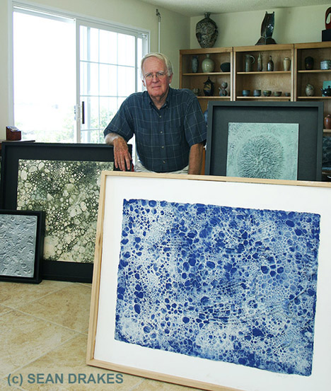“I spent twenty years doing gray scale paintings, I was getting weary of it. About that time I was doing my dissertation at New York University and read The Elements of Drawing by John Ruskin (English 19th Century critic), he said he could make mud glow if he [could] gradate it.” Zuill collected samples of mud and mixed them with an acrylic medium. “I put it on a canvas with my hands and was able to gradate it from light to dark. I got it to kind of glow.” The surrounding spare canvas he doused with gold leaf. “It’s a painting that many people respond to. That’s how I got into using natural materials.” That was in the late-80s. Zuill, 73, grew up in Smith’s Parish and earned his Master of Fine Arts degree from Rochester Institute of Technology and his Ph.D. in critical studies from NYU. Zuill’s technique is based in experimenting by mixing sand or clay with watercolor, oil, water-based or spray paints. “The best paintings are those I recycle,” admits Zuill who seldom discards things. “I pulled out a [15-year-old] painting and covered it with blue wash. I liked the ghost of the old painting underneath. I raked lines threw it then took a mixture of white clay, water, soap and acrylic medium and blew bubbles over this blue ground. For years I’ve played this game: what would happen if I did such and such, that was one of those examples.”