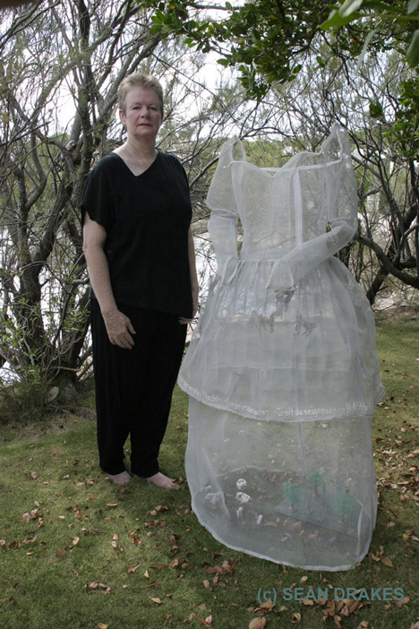 Social justice is the overall theme of Harriott’s work, specifically, social justice for women. “I have a huge sense of justice which is painful at times,” she admits. While pursuing a Bachelor of Arts Honours degree in psychology at Carlton University in Ottawa, Canada she had to choose a niche to study: women, children, addiction. “Women and domestic violence and sexual assault is what it came down to.” Her mixed-media work titled “Accessibility” is about women, but also the larger problem of access for marginalized people. “Access, who has it—who doesn’t—to education, food, water…to the basics of life. Some have so much and some have nothing. I am acutely aware about being in a privileged position as a white woman, that I have to be cautious and aware in how I speak to people.” Originally from Paget, Harriott, 56, is a trained dressmaker who relishes rusty objects. Wire, fabric, screen wire, eggs, nails and art wire are integrated into her sculptural installations. “I’m inclined to sew almost anything. What I like about working with screen wire is that it’s like fabric, but holds its shape.” She is a devotee of the “What if?” principal. “If I do this what happens…I love that idea, you’re not limited.” The conversation Harriott provokes with her couture bridal gowns is a universal and personal dialogue—she was married 22 years. “Marriage, I don’t think, is good for women—it’s a negative. Psychological tests show married men are happiest, married women are the most depressed.”